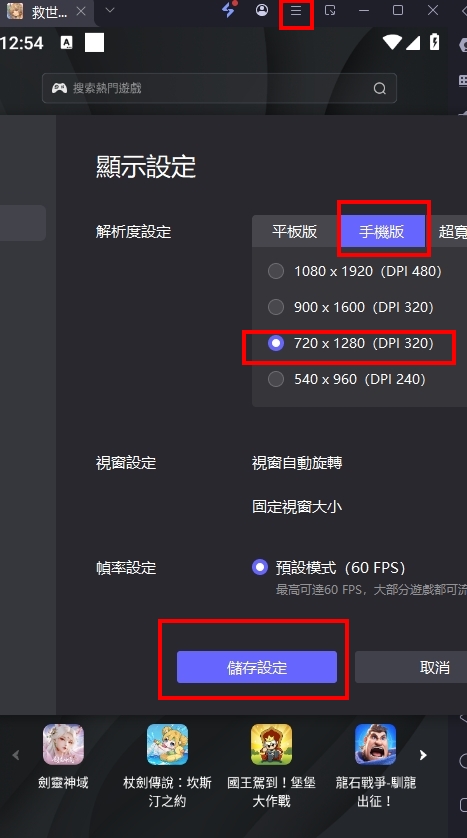 在顯示設定,選擇「手機版」,將「解析度設為720x1280(DPI320)」,儲存設定後重啟模擬器