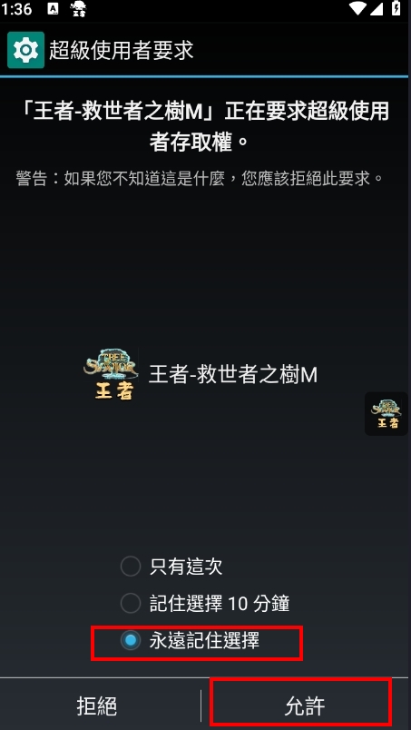 6.5. 在模擬器中開啟「救世者之樹王者APK」,並授權給輔助程式。